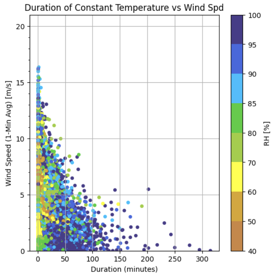 Figure 2. Duration of constant temperature (in minutes) versus median wind speed for the period of constancy. The scatter points are coloured based on the median relative humidity observed during the same constancy period.