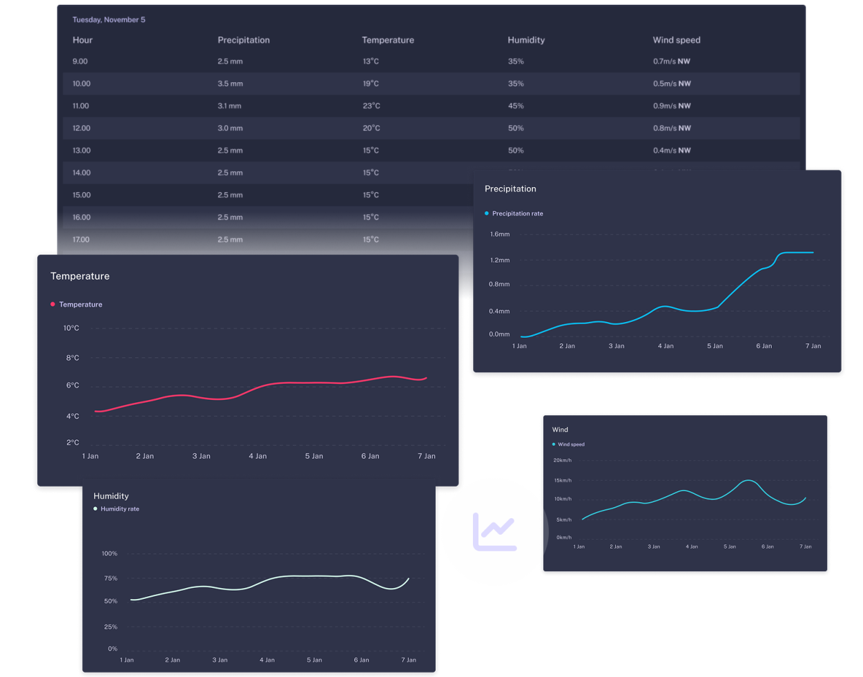 Improve your forecasts with our global weather station network. Access hyperlocal data to optimize decisions and boost efficiency. Explore the Pro for free and view nearby station data! You can use either our user-friendly web interface, or easily integrate it with your solution via our API.